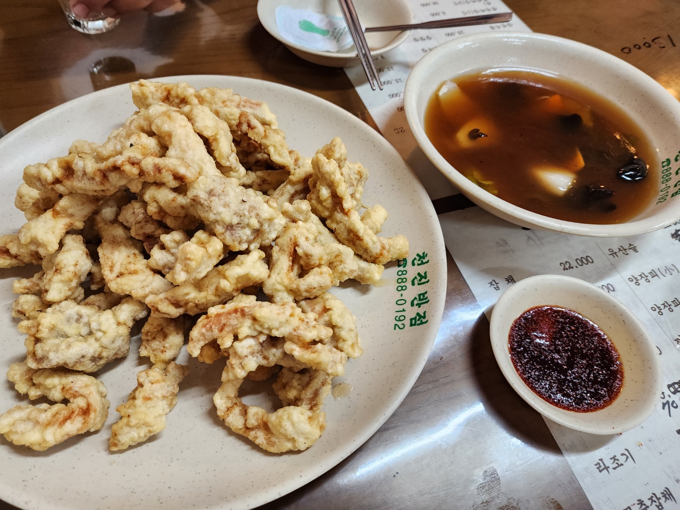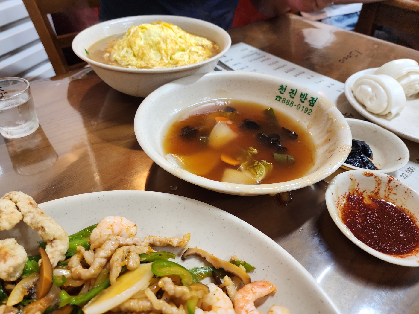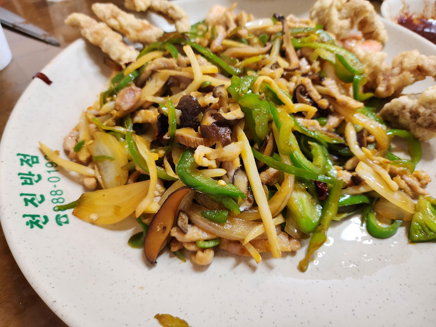 배가 너무 고픈날이라 탕수육중과 고추잡채, 자짱면 그리고 천진짬뽕(백짬뽕)을 시켰습니다.
